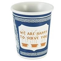 Enjoy an eco-friendly, whimsical coffee cup in a fun retro design. The nostalgic Greek design of the to-go cup made famous in NYC in 1963 is now available in reusable ceramic. The details, including design, seam, and edge fold, are so good you'll think you're drinking out of the old style paper cup. The blue and white ceramic cup bears the message "We Are Happy To Serve You," and is microwave friendly and dishwasher safe. Certified lead free and up to standard on California's Proposition 65, the cup measures 3-3/4 inches high by 3-1/4 inches wide and holds 10 ounces. It makes a great novelty gift.