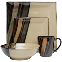 In square and round shapes, Sango's Avanti dinnerware combines contemporary design and handcrafted charm. Brushed black and clay colors awash in lustrous glaze give your casual table a warm, inviting glow. This 16-piece stoneware set includes four 11-inch square dinner plates, four 8-3/4-inch square salad plates, four cereal/soup bowls measuring 2-1/2 by 7-1/2 inches, and four 12-ounce mugs measuring four by 3-1/2 inches. All pieces feature Sango's lead-free, high-temperature, brush-applied glaze for a unique, artisan look. Sango Avanti stoneware is dishwasher-safe, and can be used in the microwave for reheating foods. This set is imported.